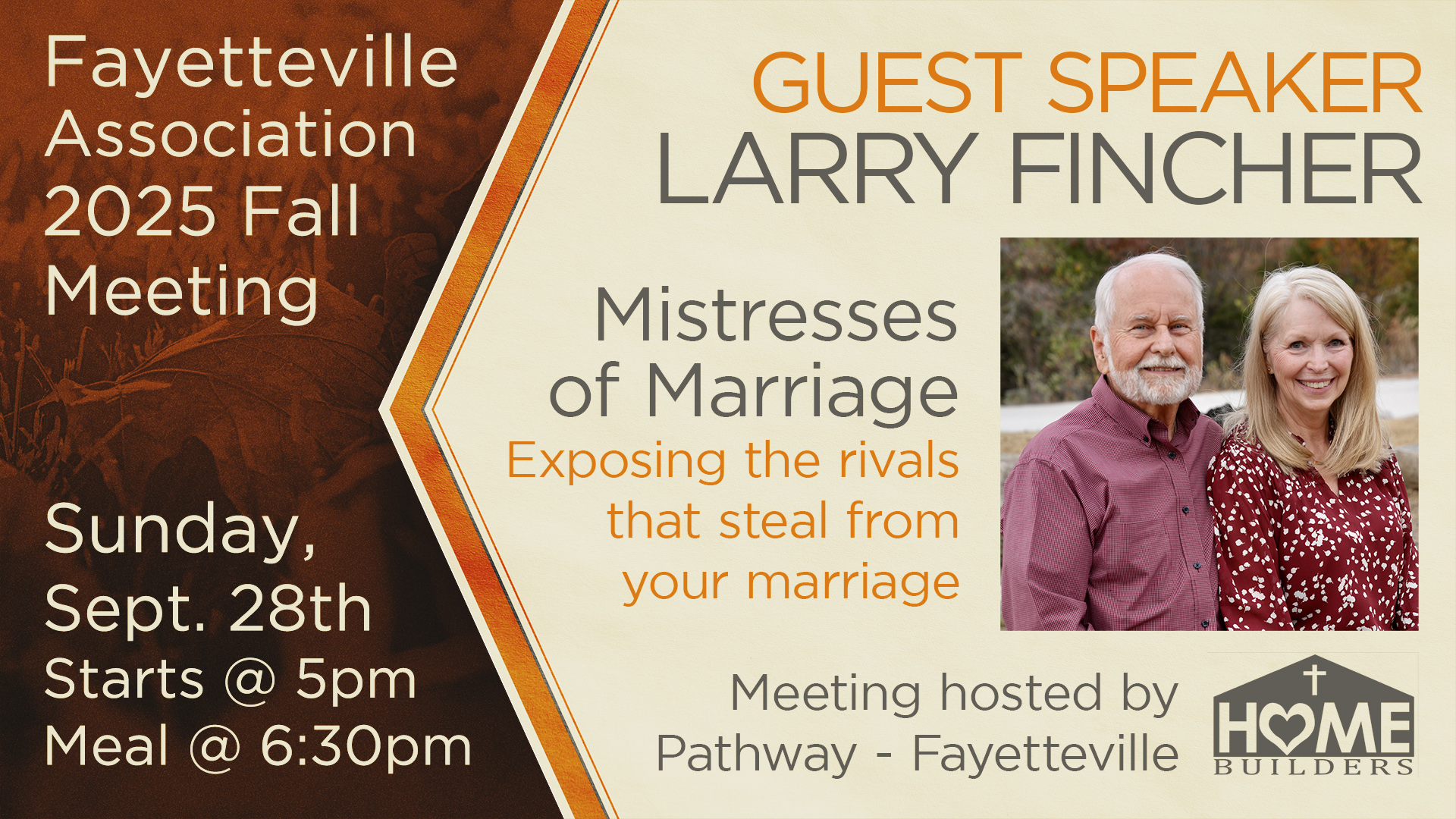 Join us for the Fall Meeting of our local association on September 28th, 2025. The Fall Meeting will have a marriage seminar emphasis with guest speaker Larry Fincher. Larry & Lorinda Fincher lead the HomeBuilders ministry, speaking at churches across the globe and hosting two marriage retreats each year.
